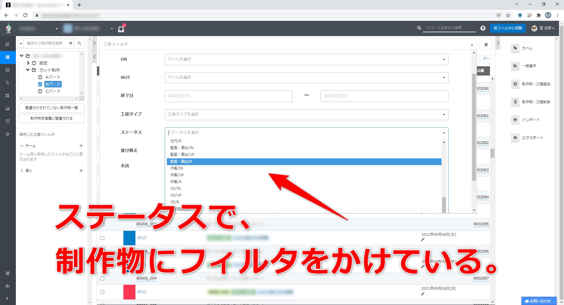 - 注)画像左: 制作物に対し、実際にステータスでフィルタをかけようとしている様子。